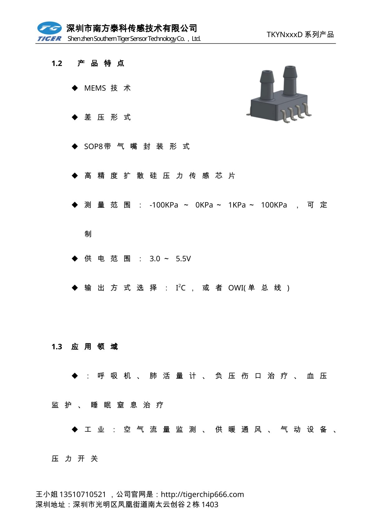 1.2产品特点 MEMS技术 表压形式 SOP8带气嘴封装形式 防潮和防油 高精度扩散硅压力传感芯片 测量范围:-100KPa~0KPa~5KPa~700KPa,可定制 供电范围:3.0~5.5V 输出方式选择:标准电压输出,或比例电压输出